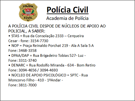 A Secretaria de Segurança Pública do Estado de São Paulo, por meio de suas Polícias Civil e Militar, proporciona atenção exclusiva aos cuidados psicológicos dos policiais que integram os quadros da Instituição, fornecendo todo o suporte necessário para a prevenção de questões relacionadas.