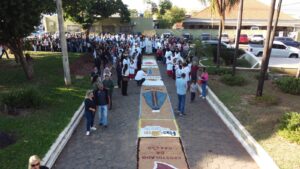 Na Paróquia São Benedito a celebração do Dia de Corpus Christi teve início com concentração na capela Nossa Ssnhora Aparecida, em direção a Igreja Matriz São Benedito. O cinegrafista Leandro Campos registrou imagens da procissão, inclusive com uso de drone. Ao longo da procissão os católicos se deparam com lindos tapetes, por onde o padre Emerson da Silva conduziu o Santíssimo Sacramento.