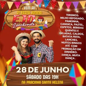 O comerciante Edno Luiz da Silva, proprietário de lanchonete na Praça Santa Helena informou que está agendado para este sábado (28), às 20h, o Arraial com comidas típicas juninas, quadrilha, brincadeiras, muita música e bingos, com prêmios exclusivos. O evento tem início a partir das 19h, e a Praça fica na avenida 47 entre as ruas 30 x 32. “Essa é a segunda edição do nosso Arraial que acontece aqui na Pracinha e gostaria de convidar a população”, afirmou Edno.
