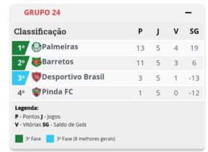 Em partida realizada na manhã deste sábado (9), no estádio Fortaleza, a equipe do Barretos Esporte Clube venceu o Desportivo Brasil pelo placar de 2 a 0. Com a vitória, a equipe garantiu a classificação a terceira fase com o segundo lugar do Grupo 24 com 11 pontos, atrás do líder Palmeiras que soma 13 pontos. As duas equipes inclusive se enfrentam na última rodada em São Paulo.