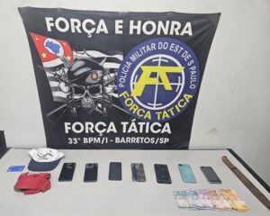 Após intensa varredura, o criminoso foi localizado, bem como os aparelhos celulares, dinheiro, faca e confessou que veio de Osasco para efetuar roubos na cidade. O acusado foi levado à D.P, onde permaneceu preso. As vítimas tiveram seus bens restituídos. Foram recuperados 07 aparelhos celulares, R$ 85,00 e 01 facão.