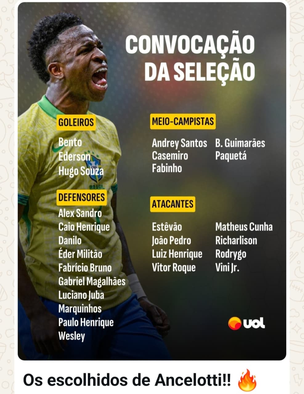 O técnico Carlo Ancelotti convocou a seleção brasileira masculina de futebol nesta segunda-feira (3) para os dois últimos amistosos de 2025, contra Senegal e Tunísia, nos dias 15 e 18 respectivamente, na Europa. As duas equipes já estão asseguradas na Copa do Mundo de 2026. A novidade na lista de 26 jogadores é a presença do lateral-esquerdo Luciano Juba (Bahia). Quem também está de volta à seleção é o atacante Vitor Roque (Palmeiras) e o meio-campista Fabinho (Al-Ittihad/Arábia Saudita) – ambos ganharam a primeira oportunidade com Ancelotti. Vitor Roque não era chamado desde 2023, e Fabinho desde a Copa do Mundo de 2022.
