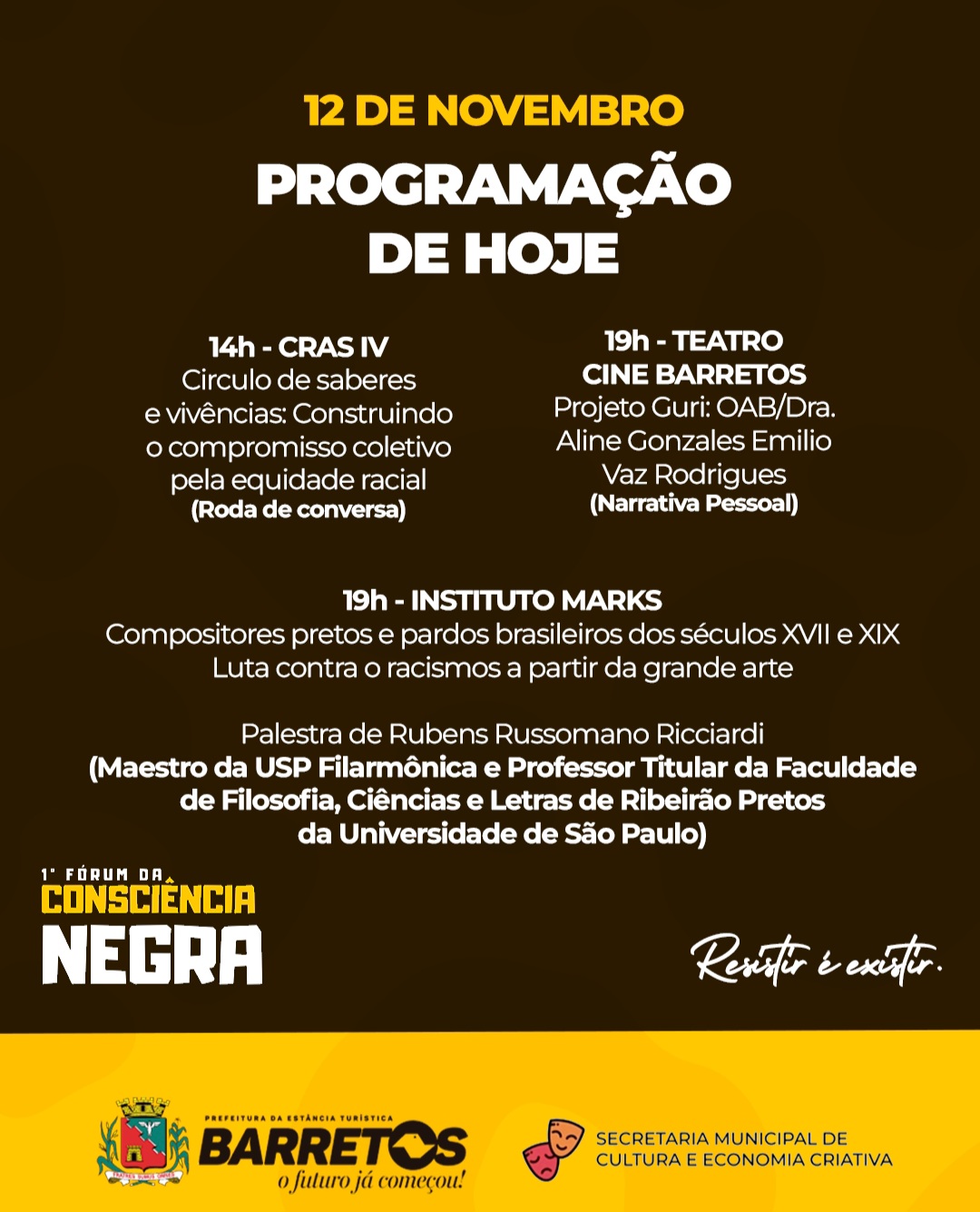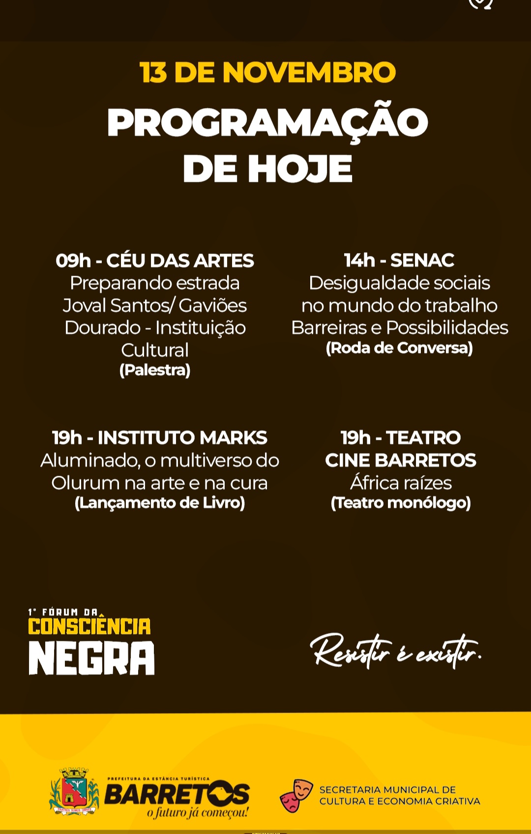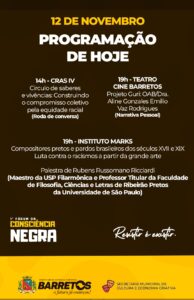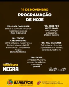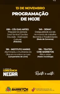 A programação completa do Fórum pode ser acessada no site da Prefeitura e nas redes sociais da Prefeitura (@prefeituradebarretos) e da Cultura (@culturabarreto.criativa). Nesta quinta-feira, 13, será realizada às 9h a palestra: ” Preparando estrada ” – Joval Santos / Gaviões Dourado, no CEU das Artes. Às 14h, no Senac Barretos, terá a roda de conversa: “Desigualdades raciais no mundo do trabalho – Barreiras e possibilidades”. Às 19h, será lançado o livro “Alumiando, O multiverso de olurum na arte e na cura, pelo grafite”, no Instituto Mark’s; no mesmo horário, será apresentado no Cine Barretos o monólogo “Áfruca Raízes”.